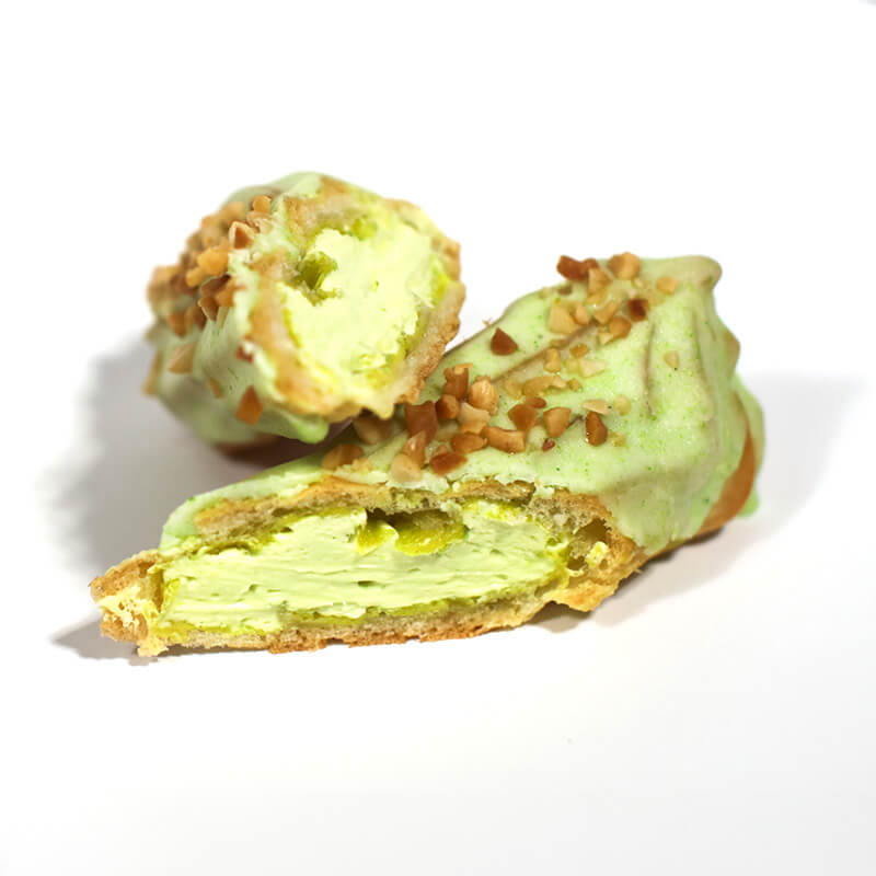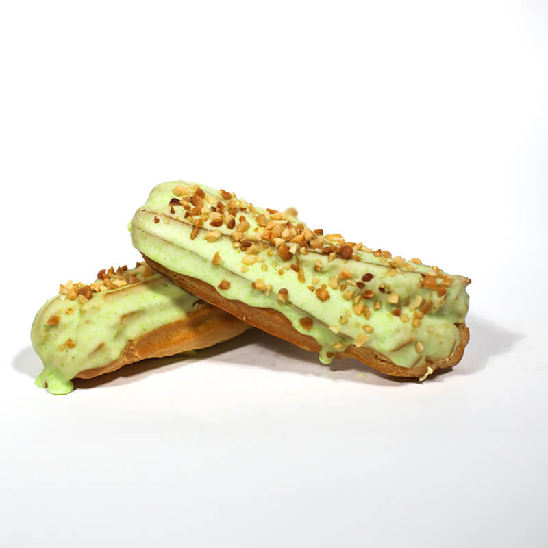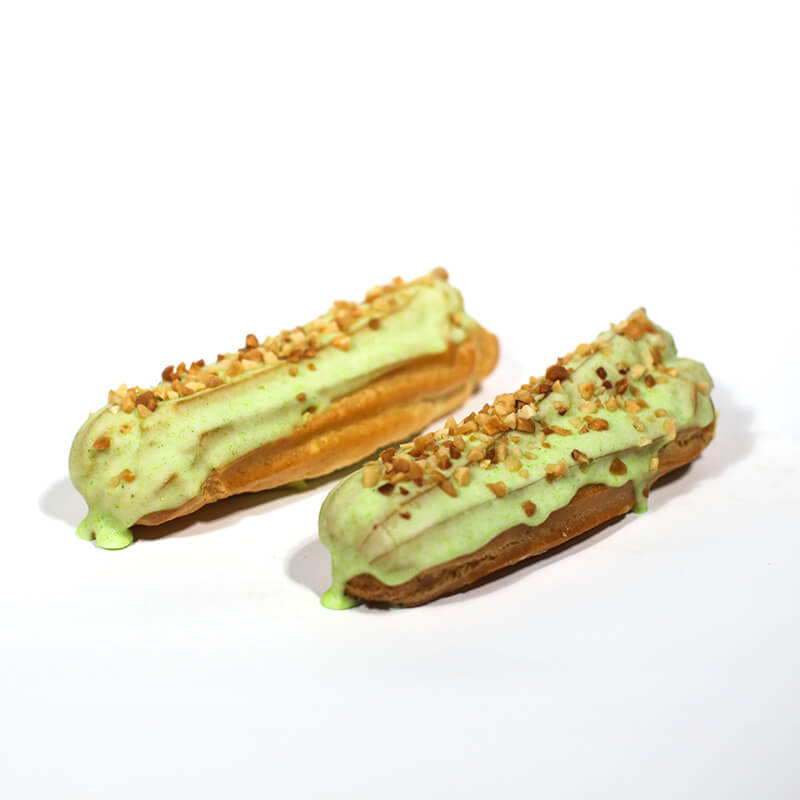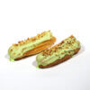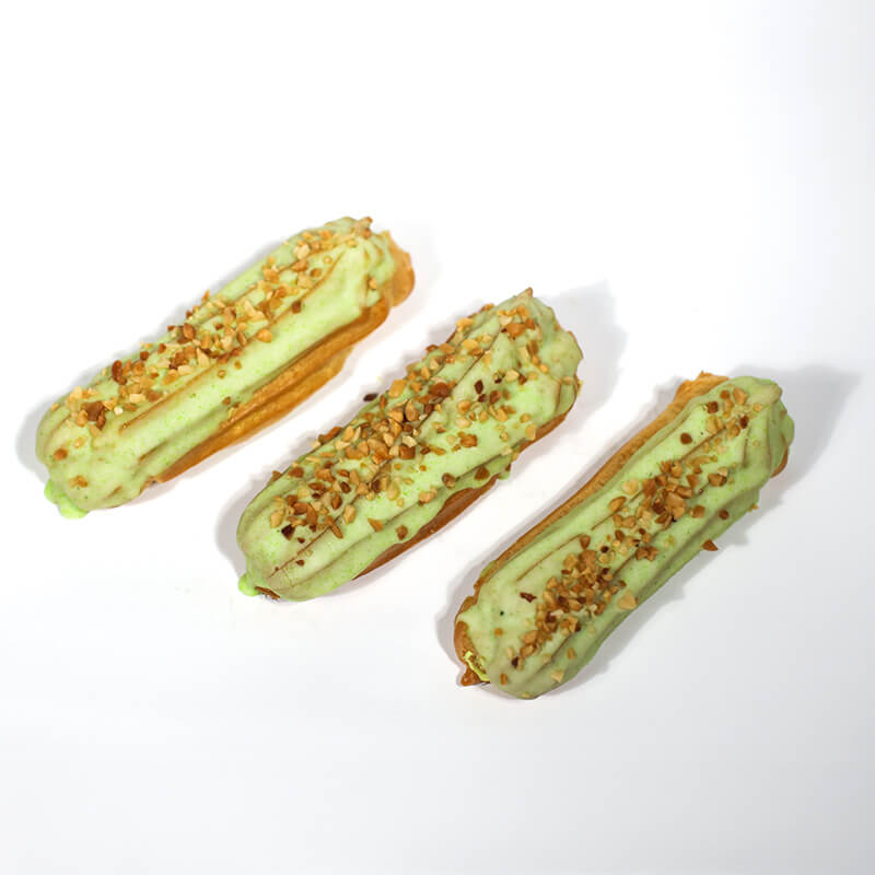 «Еклер фісташковий» — витончена варіація французького десерту для любителів горіхових смаків. Основу складає легке заварне тісто, яке при випіканні утворює порожнисте середовище та золотисту скоринку. Усередині наповнення — крем із фісташок: ніжний, оксамитово-густий і насичений природним смаком цього горіха. Зверху еклер покритий тонким шаром глазурі у світло-зелених тонах, що підкреслює горіхову тему десерту, та посипаний шматочками обсмажених фісташок, додаючи хрусткого акценту. Цей еклер чудово підходить для подачі на святкових подіях або для задоволення повсякденних смакових бажань у поєднанні з кавою чи чаєм.