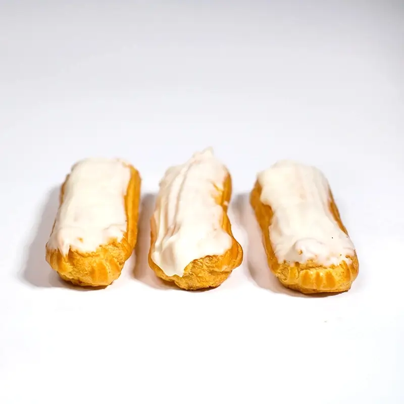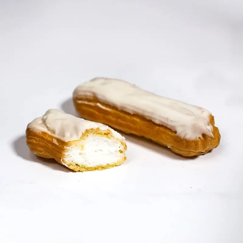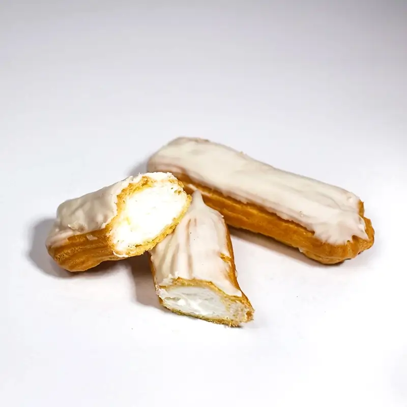 «Еклер маскарпоне» — це розкішна інтерпретація класичного французького еклера. Основу десерту становить легке й порожнисте заварне тісто, яке після випікання має приємну хрустку скоринку та м’яку середину. Ця оболонка наповнюється кремом із італійського сиру маскарпоне: крем має оксамитову консистенцію та насичений вершковий смак із легкими нотками ванілі або лимону. Зверху еклер покривають тонким шаром білого глазуру (можливо, з цукрової глазурі чи білого шоколаду), що додає десерту завершеного вигляду та легкої солодкості. Цей еклер — відмінний вибір для святкових заходів, романтичних вечорів або просто солодкого задоволення впродовж дня.