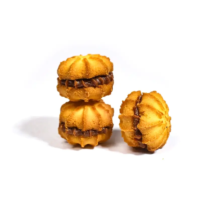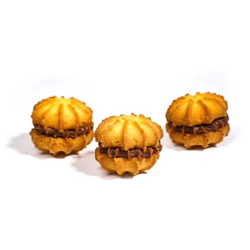 Печиво «Астра» — це вишукана випічка, що поєднує ніжні пісочні половинки та густий карамельний крем. Кожне печиво має форму квітки астри, зі злегка хрусткою, золотистою основою. Всередині знаходиться домашній карамельний крем, виготовлений за нашим рецептом: приготоване на повільному вогні згущене молоко карамелізується до ідеальної консистенції та насиченого смаку. Цей крем власного виробництва додає десерту солодких ноток та м’якої текстури, що чудово контрастує з пісочним тістом. Печиво чудово підходить для затишних посиденьок, святкових подій чи як гарний подарунок.