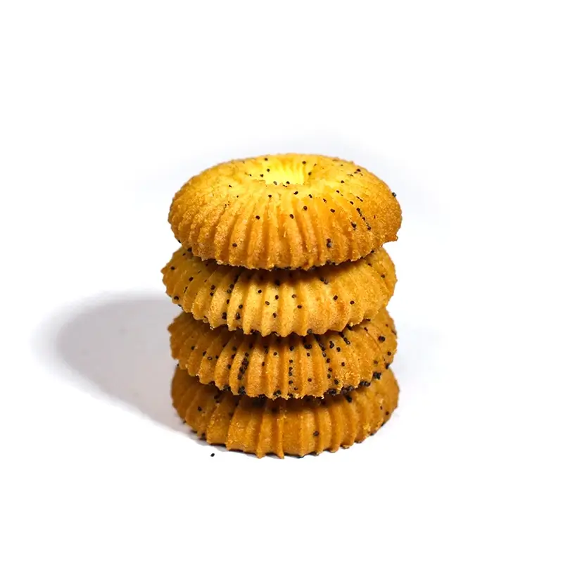 Печиво «Кільце мак» — це витончена випічка, що поєднує класичне пісочне тісто з ароматною маковою посипкою. Кожне печиво має округлу форму з хрестовидними хвилями, що утворюють рельєфний край, а в середині — невеликий отвір, що нагадує традиційне кільце. Під час випікання пісочне тісто набуває золотистої скоринки та розсипчастої текстури, а макові зернятка, рівномірно розподілені по поверхні, створюють легку горіхову нотку та приємний хруст під зубами. «Кільце мак» — чудовий десерт для повсякденних перекусів, ранкового чаю чи святкової подачі.